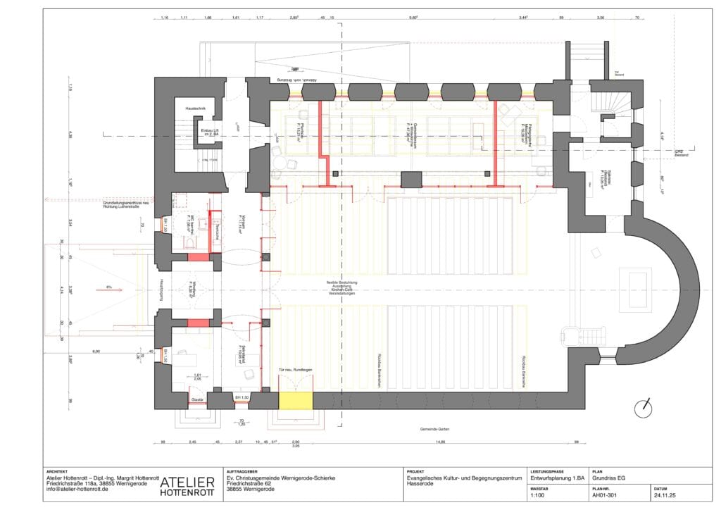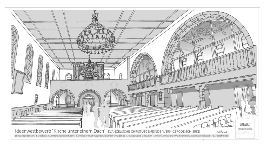 Für die Christusgemeinde Wernigerode-Schierke bedeutet dieser Prozess, dass nach dem bereits erfolgten Verkauf der alten Franckeschule in der Friedrichstraße sowie dem anstehenden Verkauf des leerstehenden Pfarrhauses in Schierke perspektivisch auch das Pfarrhaus in Hasserode aufgegeben und die Christuskirche zu einem modernen Gemeinde‑, Kultur- und Begegnungszentrum ausgebaut werden soll, in dem nicht nur alle bisherigen, sondern auch neue Funktionen und Angebote Raum finden können. Seit dem 2023 durchgeführten Architekturwettbewerb, in dessen Rahmen das Atelier Hottenrott mit dem Auftrag betraut wurde, diesen Umbau zu planen, haben sich in Rücksprache mit dem Kirchenkreis und möglichen weiteren Geldgebern verschiedene Planungsvorgaben geändert, die an diesem Abend beleuchtet werden sollten.