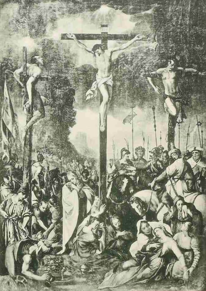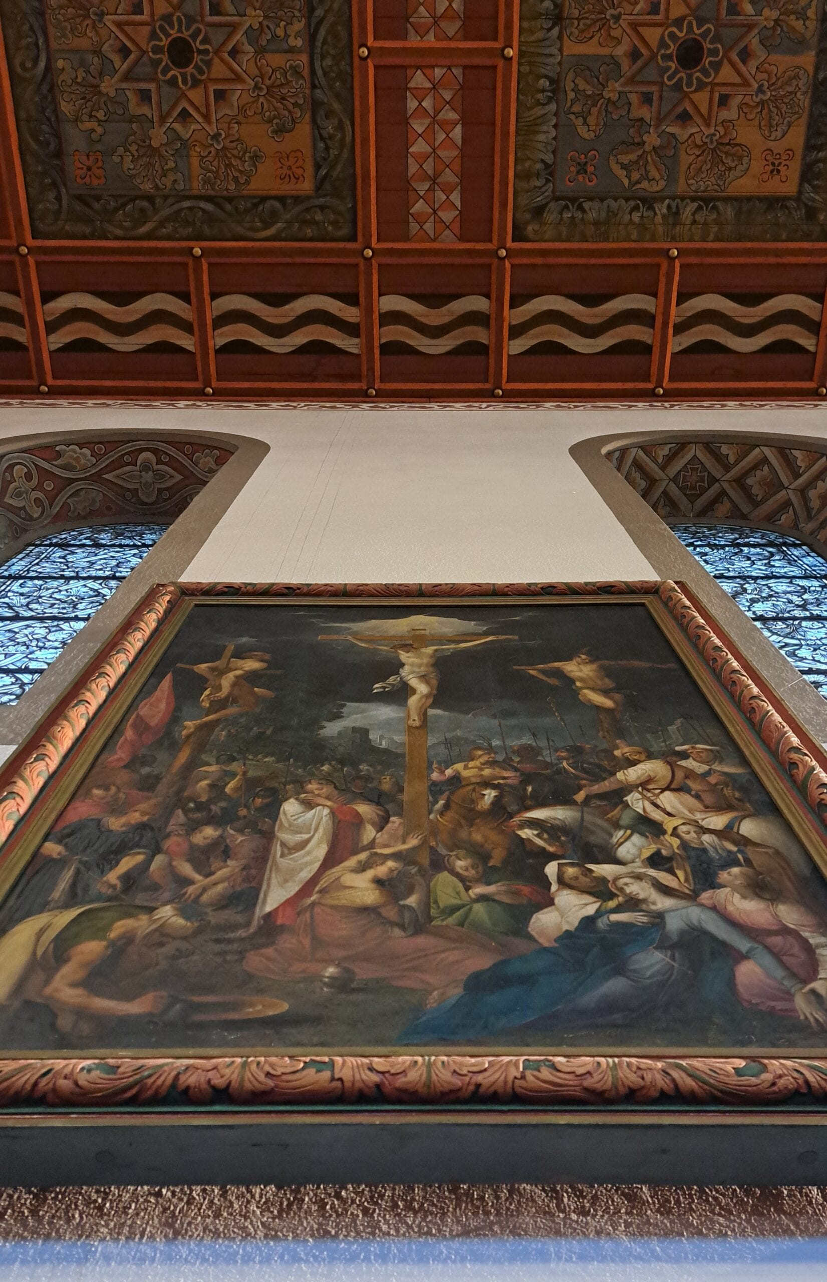 Beste Voraussetzungen, um zumindest in das kleine Pantheon regional bedeutender Künstler aufgenommen zu werden. Aber das Schicksal wollte es anders: Kaum mehr als zwei Dutzend Werke Offingers sind heute noch ihm zugeordnet und öffentlich zugänglich. Das vermutlich größte, das im Jahr 1598 kurz vor seinem Tod als letztes Meisterstück entstand, befindet sich in der Wernigeröder Christuskirche. Jeder, der unsere kleine Kirche kennt, hat es schon gesehen, möglicherweise aber nicht wirklich wahrgenommen. Es handelt sich um eine Darstellung der Kreuzigung (Öl auf Holz), die an der Wand des Südschiffs hängt, viel zu hoch und schlecht ausgeleuchtet. Fast 170 Jahre Kerzenbeleuchtung und tausende Brockenfahrten der benachbarten Harzer Schmalspurbahn haben für eine Schmutzschicht gesorgt, welche die einst als „leuchtend hell“ beschriebenen Farben allmählich verblassen ließen. Nur wenn man ganz nah herantritt und unter dem Gemälde nach oben schaut, wird einem bewusst, dass man auf ein fein ausgearbeitetes Monumentalgemälde der Spätrenaissance blickt.