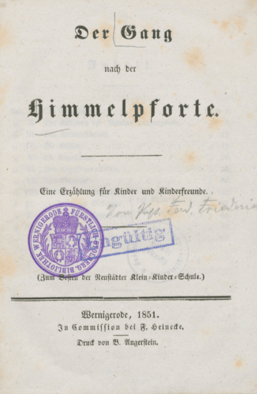 Auskunft darüber finden wir in einem Kinderbuch, welches im Jahre 1851 hier in Wernigerode verlegt wurde. Es trägt den schönen Titel „Der Gang nach der Himmelpforte: Eine Erzählung für Kinder und Kinderfreunde“ und wurde von Ferdinand Friederich verfasst, der in den 1830er Jahren als Pastor im nahegelegenen Ilsenburg tätig war. Im Jahr 2009 wurde es von der ULB – der Universitäts- und Landesbibliothek Sachsen-Anhalt – digitalisiert und steht seitdem hier – allerdings in altdeutscher Schrift – zum freien Download zur Verfügung.
