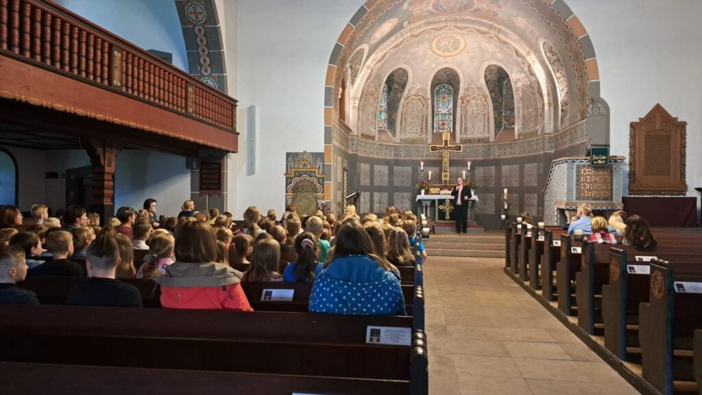 Am 05.07.2023 fand in unserer Christuskirche die traditionelle Andacht zum Ende des laufenden Schuljahrs für Schülerinnen und Schüler aller Klassenstufen der Grundschule August-Hermann-Francke sowie natürlich auch für deren Lehrkräfte und Eltern statt. Unmittelbar nach der bewegenden Abschlussfeier in der Turnhalle der Francke-Schule ging es für alle Interessierten einfach “rüber” in die Kirche, wo die Andacht für rund 80 Schülerinnen und Schüler und ein gutes Dutzend erwachsene Begleiter in diesem Jahr erstmalig von Mirjam Reinboth gehalten wurde, unserer Gemeindepädagogin in Ausbildung.